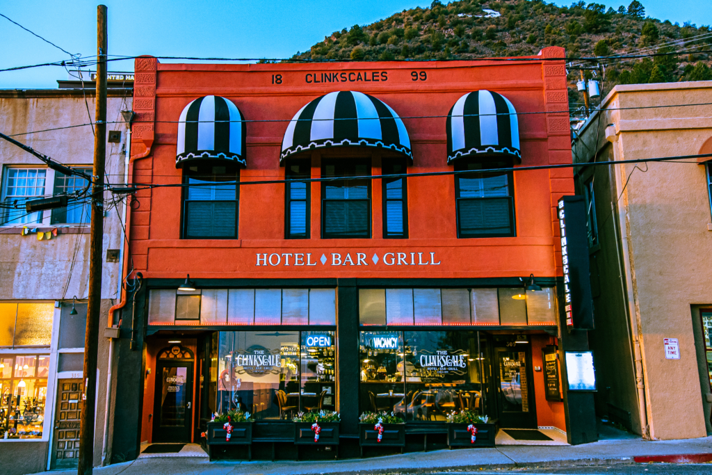 The Clinkscale building in Jerome, Arizona was built in the 1800 when the town was a bustling mining town. It was reopened as the Clinkscale Hotel, Bar and Grill in 2020. https://azbigmedia.com/lifestyle/cool-places-to-stay-in-northern-arizona-this-summer/