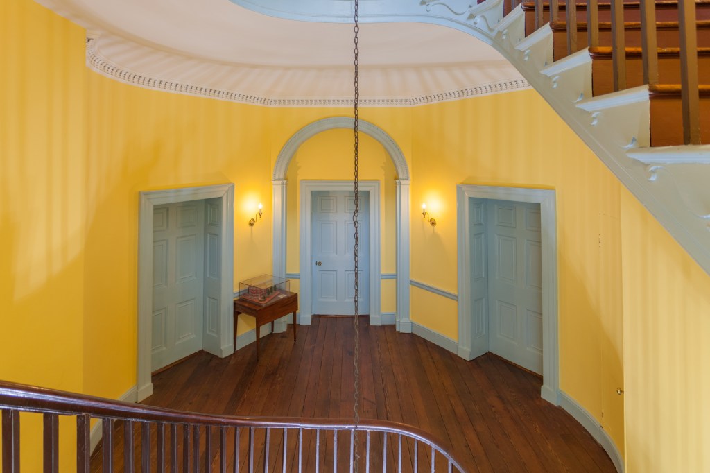 The house is beautiful. Bright and “happy” painted in cheerful yellow, but with all of its history it’s not hard to believe there is some unexplained activity late at night. Photo; ajjn-photography https://www.mortarr.com/photo/view/images/project_gallery_images/the-octagon-washington-dc-main-staircase-2nd-level-room-doors/40059