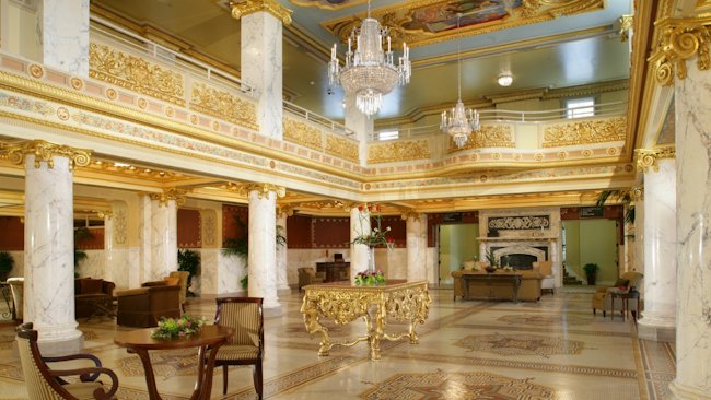 The lobby of the French Lick Hotel with its ornate ceilings and mosaic tiles floors. https://www.luxurytravelmagazine.com/news-articles/indianas-french-lick-resort-golfers-heaven