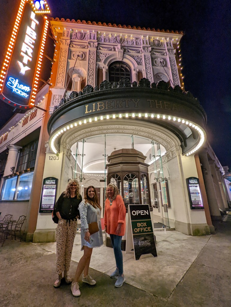 Beth’s favorite “long legs” photo. My sister (Chris), Beth, and me infront of the haunted Liberty Theater.