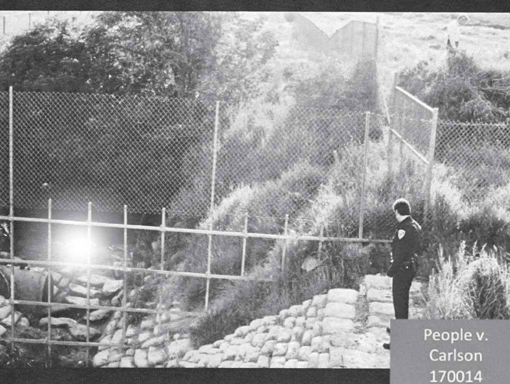 An officer looks down on the crime scene shortly after Tina’s body was found. The body is blurred out by the white flash. Courtesy of the Alameda County District Attorney’s Office. https://crimecapsule.com/what-happens-when-the-dead-begin-to-speak/